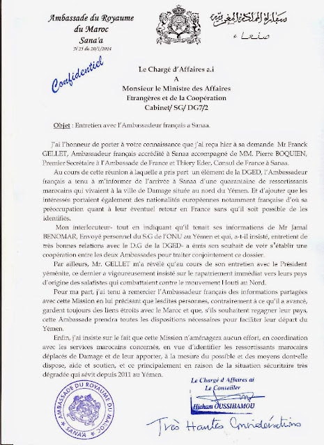 El diplomático francés pidió ayuda marroquí para identificar a cuarenta ciudadanos marroquíes que luchaban con Al Qaeda en Yemen contra los rebeldes houthies en la ciudad de Damage y que llegaron a Saná. « Llevaban nacionalidades europeas, la mayoría franceses. De ahí su preocupación por su eventual retorno a Francia sin que sea posible identificarlos », agrega la nota.