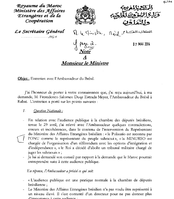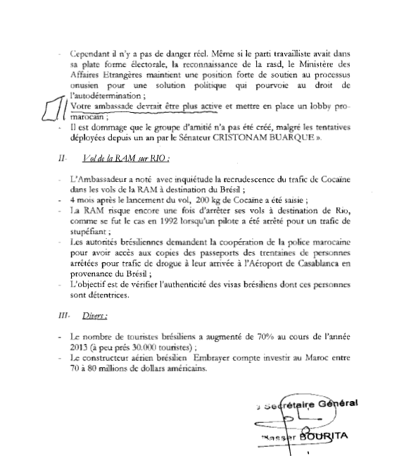 Selon l’information rapportée par une note confidentielle diffusée par Bourita, le diplomate brésilien a rappelé que « la RAM risque encore une fois d’arrêter ses vols à destination de Rio, comme ce fut le cas en 1992 lorsqu’un pilote a été arrêté pour un trafic de stupéfiante ».