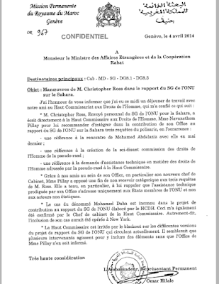 Dans une note envoyée au ministre marocain des Affaires Etrangères, l’ambassadeur du Maroc à Genève dénonce des manoeuvres présumées de l’Envoyé Personnel du Secrétaire Général de l’ONU pour le Sahara Occidental, Christopher Ross pour introduire des amendes au rapport de Ban Ki-Moon sur l’ancienne colonie espagnole. Il dévoile aussi ses deux sources d’information, à savoir le « nouveau chef de cabinet de Mme Navi Pillay » et leur « ami au Haut Commissariat aux Droits de l’Homme ».