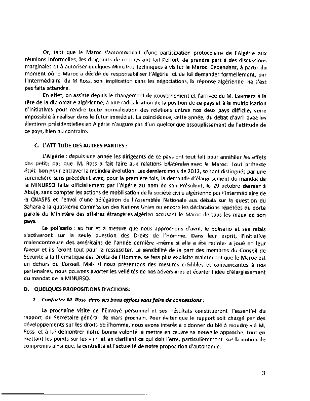 Selon le texte de ce mémorandum, l’examen par le Conseil de Sécurité de la question du Sahara occidental se situe dans un contexte particulièrement difficile marqué par une attente de leurs partenaires de mesures concrètes en matière des Droits de l’Homme.