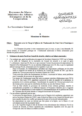 J’ai l’honneur de porter à votre connaissance que j’ai reçu le 22/04/2014, à sa demande, Monsieur David Greene, Conseiller politique près l’Ambassade des Etats-Unis d’Amérique à Rabat. Lors de cette rencontre, les points suivants ont été abordés :