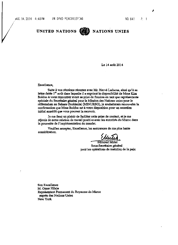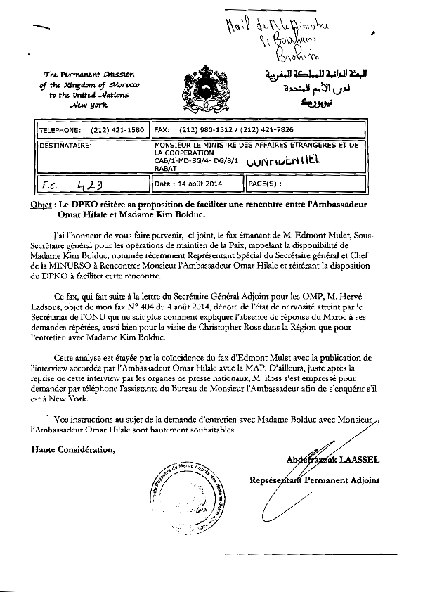 Selon la note, le Secrétariat de l’ONU « ne sait plus comment expliauer l’absence de réponse du Maroc à ses demandes répétées, aussi bien pour la visite de Christopher Ross dans la région que pour l’entretien avec Madame Kim Bolduc ».
