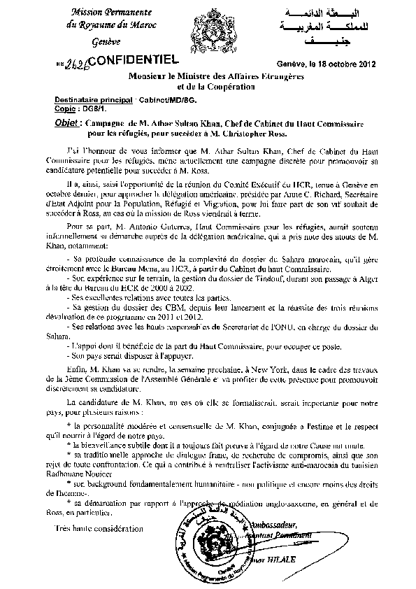 Selon une note envoyée par l’ambassadeur du Maroc à Genève le 18 octobre 2012, « M. Athar Khan, Chef de Cabinet du Haut Commissaire pour les réfugiés, mène actuellement una campagne pour promouvoir sa candidature potentielle pour succéder à M. Ross ».