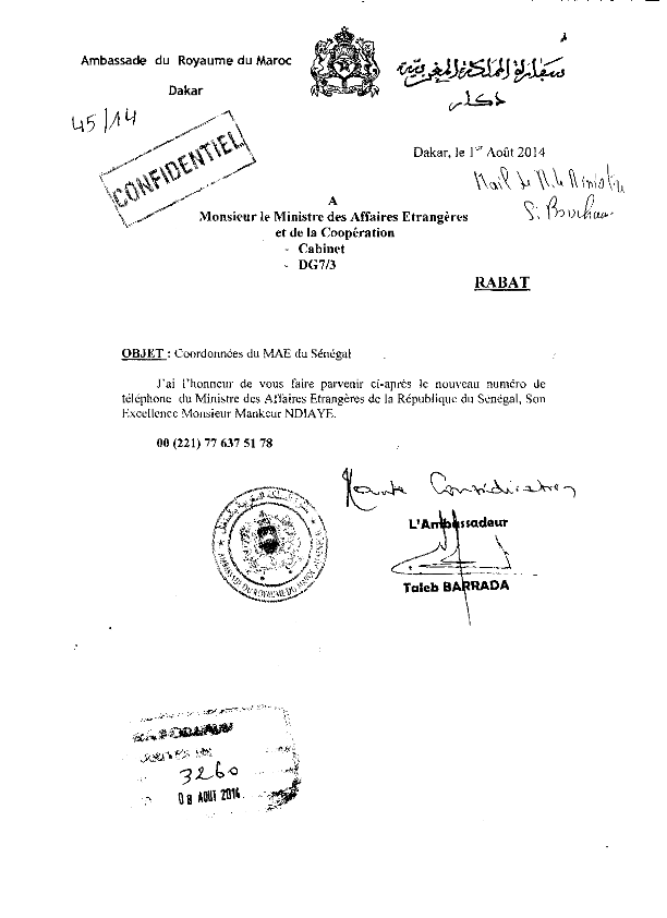 Le 1er août 2014, le Minstre des Affaires Etrangères du Sénégal, M. Mankeur Ndiaye, a fait la requête des trois billets pour un pèlerinage à La Mecque pour trois de ses proches, l’ambassadeur du Maroc á Dakar, Taleb Barrada, a envoyé une deuxième lettre à Rabat pour communiquer le nouveau numéro de téléphone de Ndiaye, qui est comme suit: 00 (221) 637 51 78