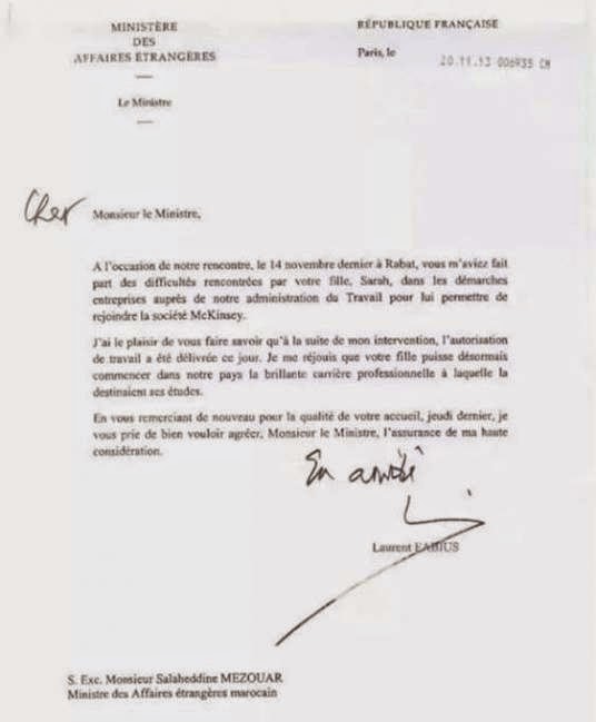 Ils sont minables dans leur nature. Y a-t-il de pire, ou plus minable, qu’un ministre qui dirige la diplomatie de son pays, de quémander les services d’un autre ministre pour intervenir en faveur de sa fille ? Sans doute non. Cela s’est passé au Maroc où le ministre Salaheddine Mézouar a demandé à son homologue français, Laurent Fabius, d’intervenir en faveur de sa fille pour que celle-ci obtienne un permis de travail et rejoigne l’équipe de la société Mc Kinsey France, une société connue pour ses trafics d’influence et ses plans de redressements autant au Maroc qu’au Sénégal. Dans une lettre datée du 20 novembre 2013 et envoyée á Mézouar, Fabius explique être intervenu à sa demande auprès de l’administration de la société en réponse à la demande de son homologue marocain. Une histoire on ne peut plus ridicule !