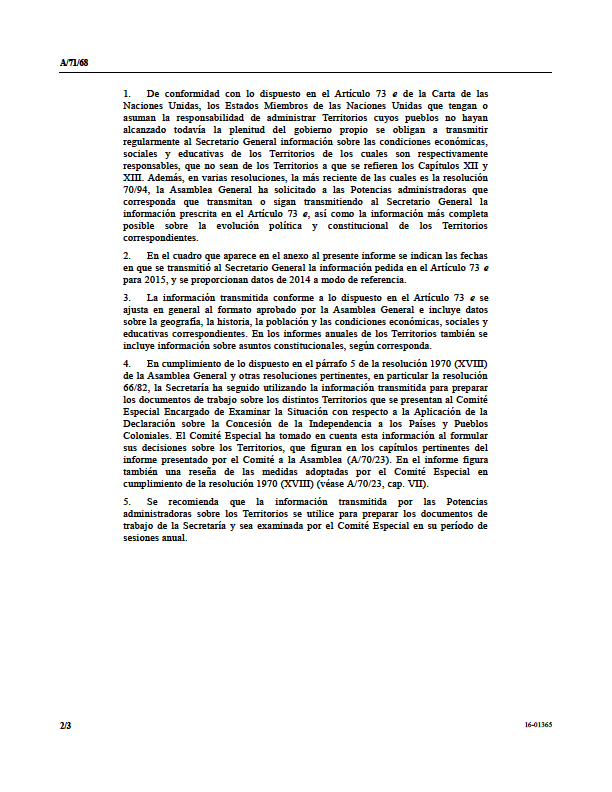 En un informe del Secretario General de la ONU, elaborado en cumplimiento de la resolución 70/94 de la Asamblea General y que se refiere a la información que deben transmitir las Potencias administradoras con arreglo al Artículo 73 e de la Carta de las Naciones Unidas, se designa claramente a España como potencia admonistradora del Territorio No Autónomo del Sáhara Occidental.