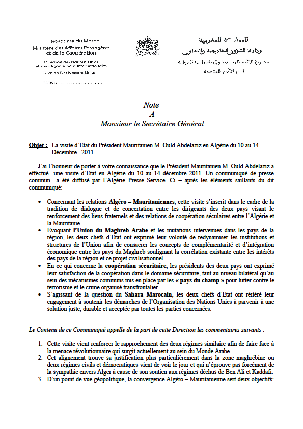 J’ai l’honneur de porter à votre connaissance que le Président Mauritanien M. Ould Abdelaziz a effectué une visite d’Etat en Algérie du 10 au 14 décembre 2011. Un communiqué de presse commun a été diffusé par l’Algérie Presse Service. Ci – après les éléments saillants du dit communiqué:
