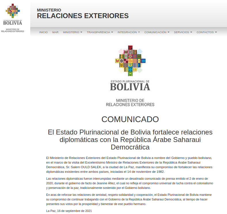 El Ministerio de Relaciones Exteriores del Estado Plurinacional de Bolivia a nombre del Gobierno y pueblo boliviano, en el marco de la visita del Excelentísimo Ministro de Relaciones Exteriores de la República Árabe Saharaui Democrática, Sr. Salem OULD SALEK, a la ciudad de La Paz, manifiesta su compromiso de fortalecer las relaciones diplomáticas existentes entre ambos países, iniciadas el 14 de noviembre de 1982.