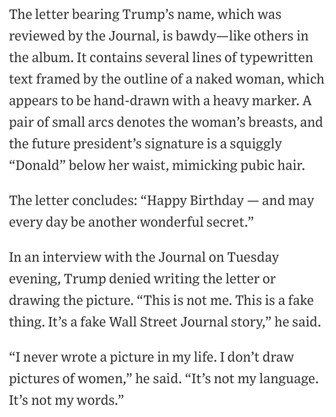 La lettre se conclut par : « Joyeux anniversaire, et que chaque jour soit un autre merveilleux secret. » Donald Trump nie en être l’auteur.