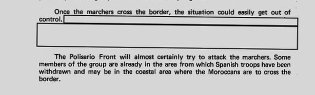 « La zone où les manifestants ne sont pas censés marcher est clairement signalée comme un champ de mines. Juan Carlos a affirmé que les forces espagnoles utiliseront tous les moyens à leur disposition pour empêcher les Marocains de franchir cette ligne »… « Une fois la frontière franchie, la situation peut facilement dégénérer. » Il est également fait mention des possibles mouvements du Front Polisario : « Certains de ses membres se trouvent dans la zone déjà évacuée par les troupes espagnoles »… « Il est presque certain qu’ils tenteront d’attaquer les manifestants. »