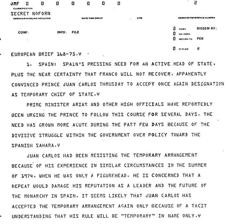Il y a peu d’enthousiasme pour Juan Carlos et la monarchie en Espagne, mais une certaine disposition à le soutenir en l’absence d’alternative… S’il parvient à maintenir l’ordre tout en ouvrant le pays politiquement, il gagnera du soutien. Le défi est immense. Et il est peu probable que le nouveau roi ait les qualités nécessaires pour y parvenir. — Rapport secret de la CIA