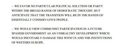 « …nous ne favoriserons aucun parti politique en particulier, au-delà des décisions démocratiques, mais nous anticipons que la transition sera essentiellement entre les mains du bloc conservateur. » « Nous verrions la participation du parti communiste à un futur gouvernement espagnol comme quelque chose de très négatif, qui nuirait irrémédiablement aux liens avec nous et avec les institutions d’Europe occidentale. » « …les pays d’Europe occidentale devraient prendre part à la prise de pouvoir de Juan Carlos et aux funérailles de Franco dans une perspective tournée vers l’avenir, et non dans une logique de reproches sur le passé. »