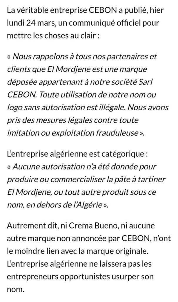 Basée à Alger, la société Sarl CEBON est détentrice de la marque El Mordjene, déposée et protégée. Elle a publié un communiqué officiel le 24 mars 2025 cf photo