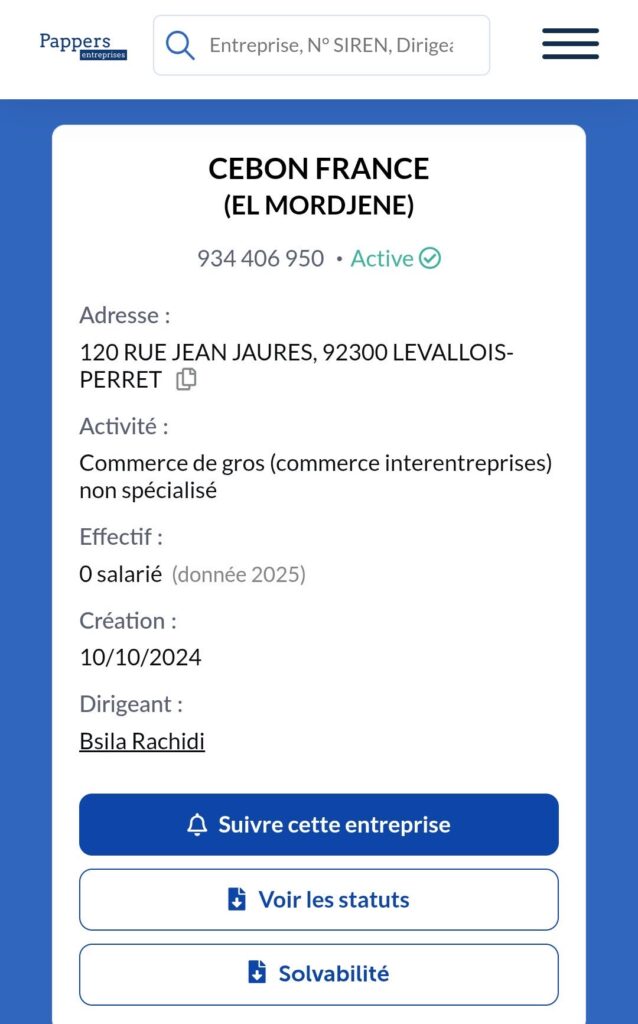 La société CEBON FRANCE (EL MORDJENE) a été enregistrée le 10 octobre 2024 à Levallois-Perret, sous le SIREN 934 406 950, avec 0 salarié déclaré. Elle est dirigée par Rachidi Bsila, né en octobre 1980, de nationalité marocaine, déjà impliqué dans une procédure collective passée. Il est également lié à d’autres structures comme Mobilwheel et Lounge Events.