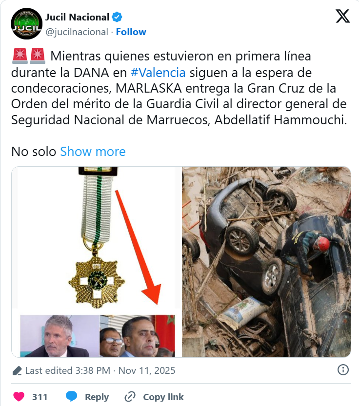 De hecho, la asociación de guardias civiles, Jucil, ya denunció en mayo que «la Guardia Civil publicó una lista de condecorados en los que no estaban todos los intervinientes que lo merecían y había personas que no habían pisado el barro». «No solo les dan millones, también les congratulan a pesar del fracaso con la inmigración ilegal y el narcotráfico», señala Jucil.