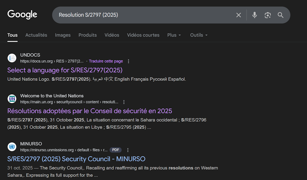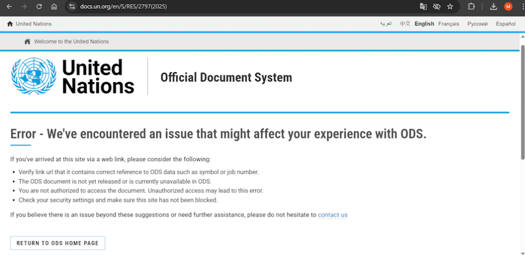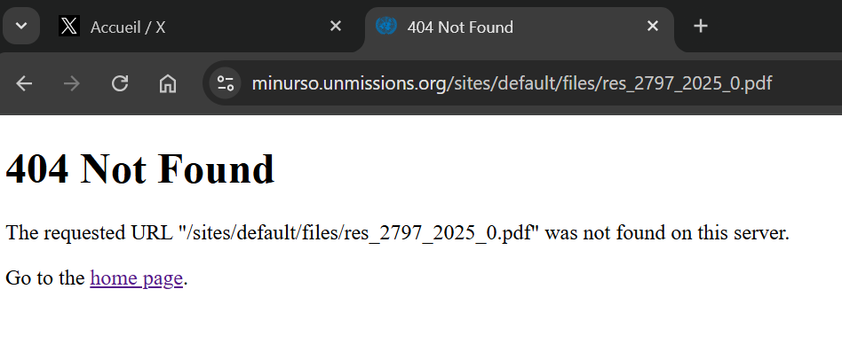 La page contenant le texte de la dernière résolution du Conseil de Sécurité sur le Sahara Occidental [S/2797 (2025)] n’est plus accessible sur les sites des Nations Unies et de la MINURSO. A la place s’affiche un message d’erreur « 404 »: