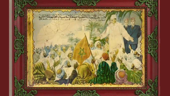 La première remarque : la personne qui a dessiné cette image a représenté les gens en train de saluer le Sultan Mohammed V avec les costumes traditionnels des différentes régions du Royaume du Maroc. Mais on constate qu’il n’a absolument pas représenté le costume sahraoui des habitants du Sahara occidental, ce que l’on appelle la darraa.