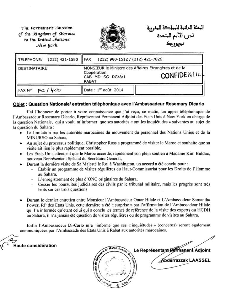 وفي مذكرتها الإخبارية المؤرخة في 2 أكتوبر 2014، ترسم مديرية الشؤون الأمريكية بوزارة الخارجية المغربية صورة قاتمة لتطور ملف الصحراء في أروقة الأمم المتحدة: «إن الوضع العام يبعث على القلق، ويثير عدة تساؤلات، وينذر بفترات صعبة سواء داخل الأمم المتحدة أو مع شركائنا الأمريكيين…».