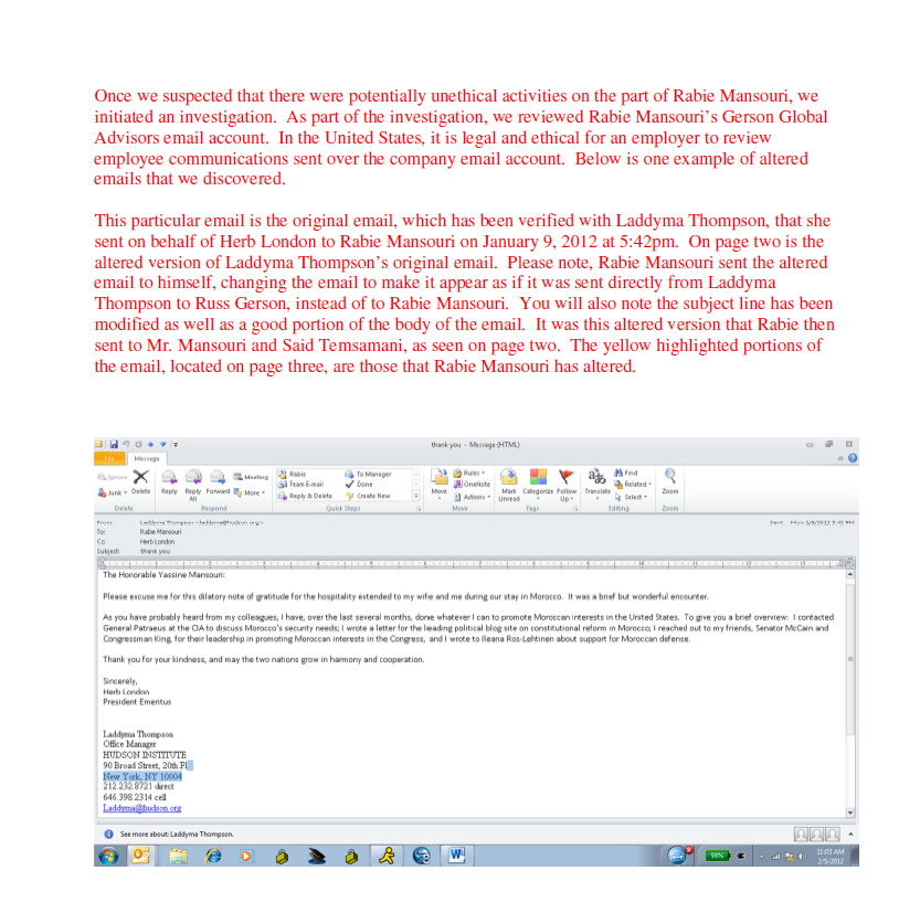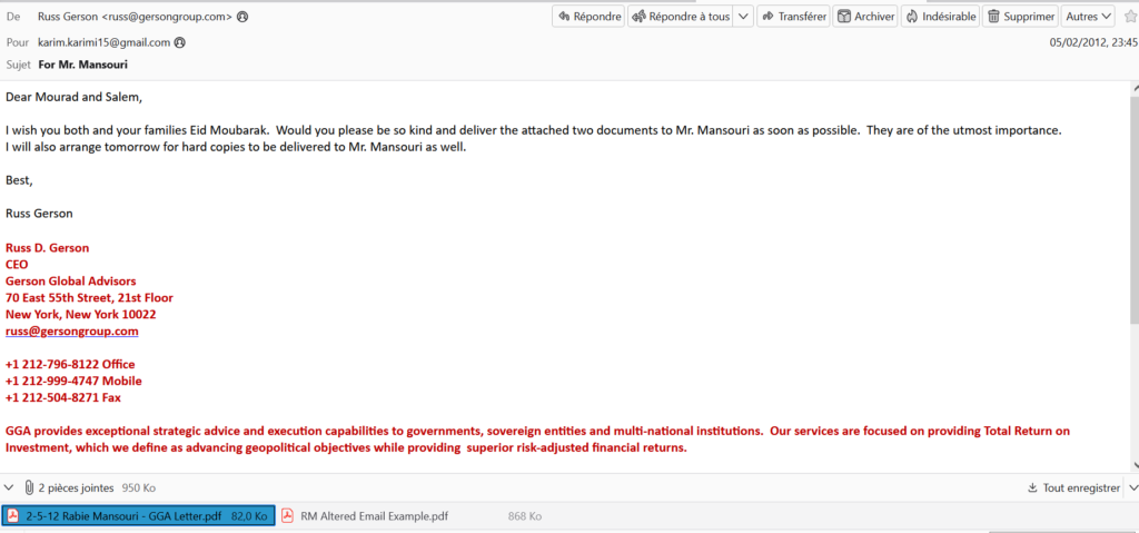 Une lettre interne de GGA accuse Rabie Mansouri », membre du cabinet et collaborateur proche de la DGED, et le dénommé Saad Bendidi, d’avoir tenté, entre 2011 et 2012, de « prendre le contrôle de l’entreprise ou de la détruire », via des « falsifications d’emails » destiné à la DGED. Parmi les preuves : un courrier électronique altéré destiné à « Yassine Mansouri » , directeur de la DGED.