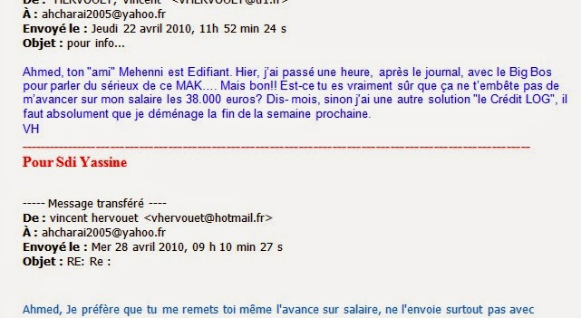 وتشير رسائل أخرى إلى وجود معاملات مالية بين أحمد الشرعي وفانسان إرفويه. وهذه المرة، تتعلق برسائل أرسلها إرفويه نفسه إلى الشرعي، ثم قام هذا الأخير بإحالتها إلى جهة اتصاله — أي على ما يبدو إلى DGED. ففي 22 أبريل 2010، على سبيل المثال، يسأل الصحفي الفرنسي أحمد الشرعي: «هل أنت متأكد أن الأمر لا يزعجك أن تسلفني 38 ألف يورو من راتبي؟» قبل أن يضيف الشرعي، عند إحالة الرسالة إلى جهة اتصاله المعتادة، والتي يُحتمل أنها ياسين المنصوري: «إلى سيدي ياسين. أعتقد أننا نستطيع القيام بهذه اللفتة!».