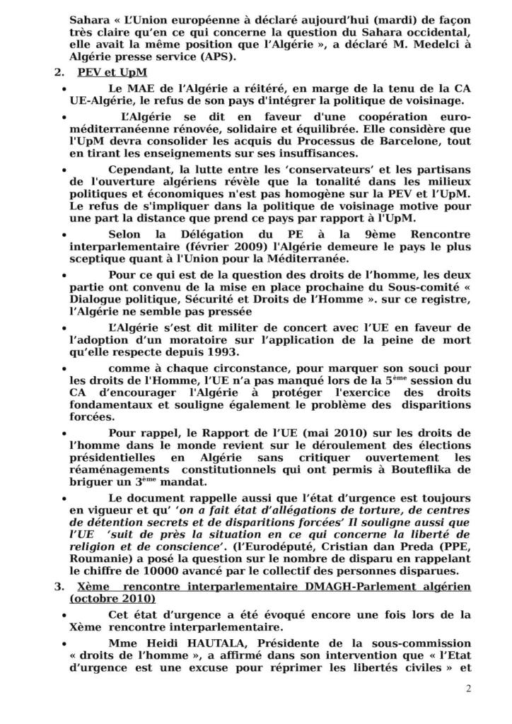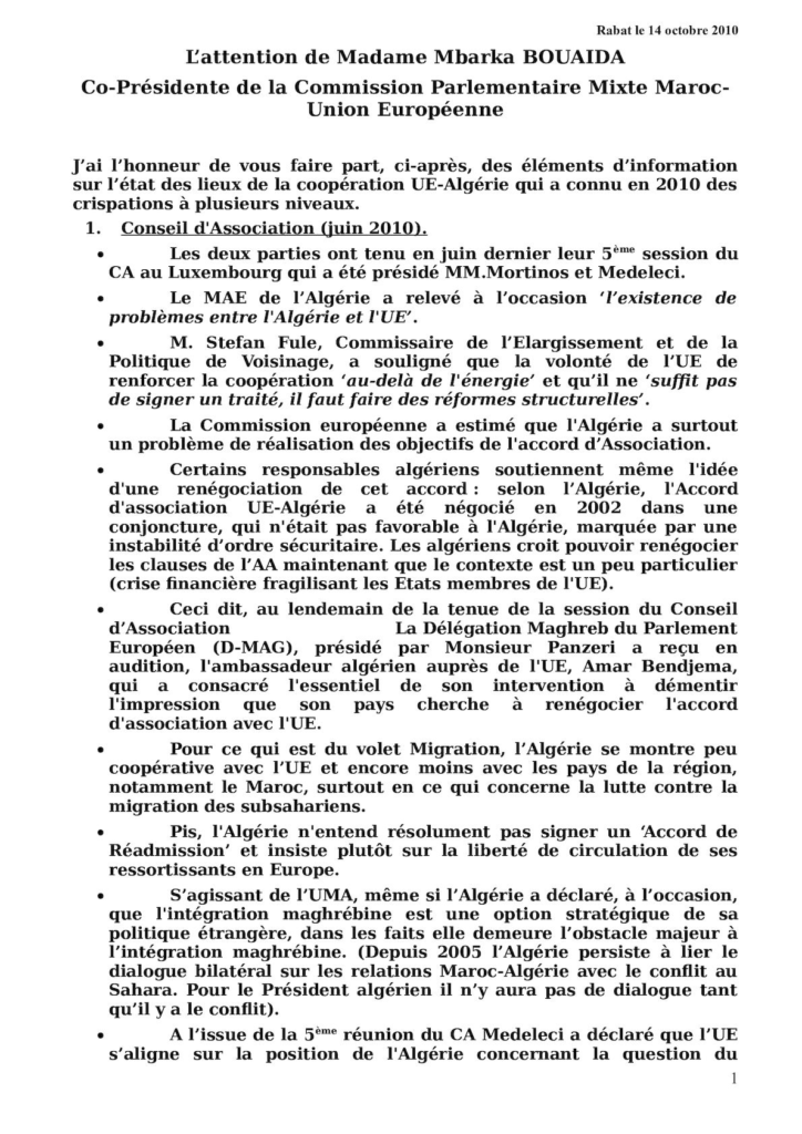 يشرفني أن أوافيكم، فيما يلي، بعناصر معلوماتية حول وضعية التعاون بين الاتحاد الأوروبي والجزائر، والذي شهد في عام 2010 تشنجات على عدة مستويات.