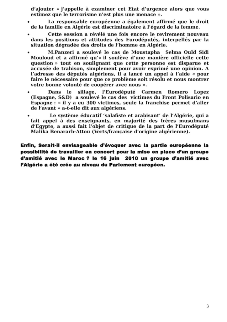 وأخيراً، هل من الممكن إثارة إمكانية العمل بالتنسيق مع الجانب الأوروبي لإنشاء مجموعة صداقة مع المغرب؟ ففي 16 يونيو 2010، تم إنشاء مجموعة صداقة مع الجزائر على مستوى البرلمان الأوروبي.