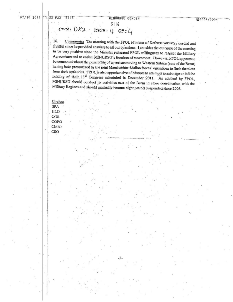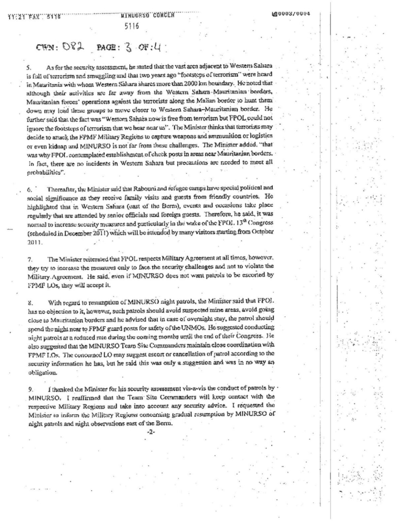 Comments: The meeting with the FPOL Minister of Defense was very cordial and fruitful since he provided answers to all our questions. I consider the outcome of the meeting to be very positive since the Minister reiterated FPOL willingness to respect the Military Agreements and to ensure MINURSO’s freedom of movement. However, FPOL appears to be concerned about the possibility of terrorists moving to Western Sahara (east of the Berm) having been pressurized by the joint Mauritanian-Malian forces’ operations to flush them out from their territories. FPOL is also apprehensive of Moroccan attempts to sabotage or foil the holding of their Congress scheduled in December 2011. As advised by FPOL, MINURSO should conduct its activities east of the Berm in close coordination with the Military Regions and should gradually resume night patrols suspended since 2008.