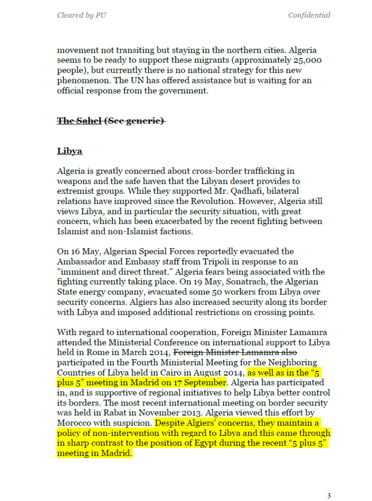 وفيما يتعلق بالتعاون الدولي، حضر وزير الخارجية لعمامرة المؤتمر الوزاري حول الدعم الدولي لليبيا الذي عقد في روما في مارس 2014، كما شارك في الاجتماع الوزاري الرابع لدول جوار ليبيا الذي عقد في القاهرة في أغسطس 2014، وكذلك في اجتماع « 5 زائد 5 » في مدريد في 17 سبتمبر. وشاركت الجزائر وتدعم المبادرات الإقليمية لمساعدة ليبيا على التحكم في حدودها بشكل أفضل. وكان آخر اجتماع دولي حول أمن الحدود قد عقد في الرباط في نوفمبر 2013، ونظرت الجزائر إلى هذا الجهد من قبل المغرب بريبة. وبالرغم من مخاوف الجزائر، فإنها تلتزم بسياسة عدم التدخل فيما يتعلق بليبيا، وقد برز ذلك بشكل واضح في التباين مع موقف مصر خلال اجتماع « 5 زائد 5 » الأخير في مدريد.