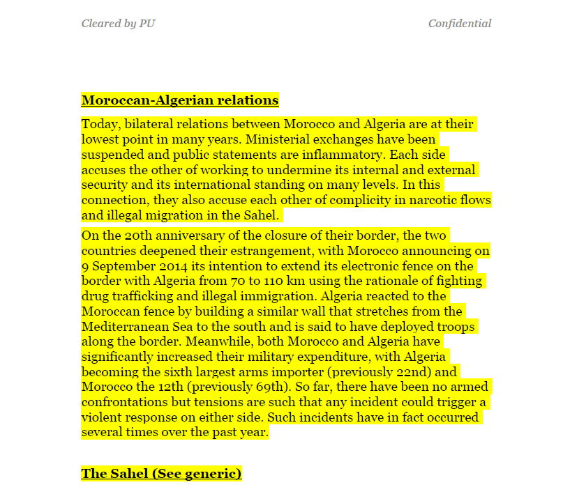 « قام المخترق (الهكر) كريس كولمان بنشر وثيقة سرية حول تورط المغرب في أنشطة تجسس تستهدف الأمانة العامة للأمم المتحدة والبعثة الأممية في الصحراء الغربية (مينورسو). وفيما يلي محضر الاجتماع الذي جمع رئيس الدبلوماسية الجزائرية مع الأمين العام للأمم المتحدة، بان كي مون. »