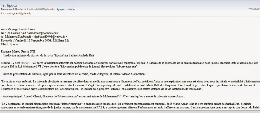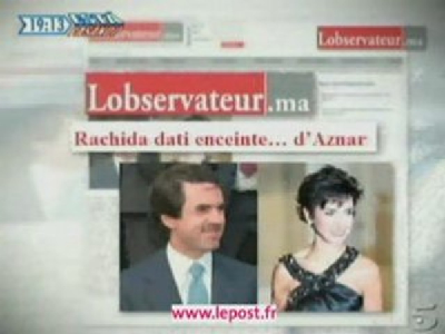 «في 2 شتنبر، أعلن الموقع الإلكتروني المغربي “لوبسرفاتور” بضجة كبيرة أن الرئيس السابق للحكومة الإسبانية، خوسيه ماريا أزنار، هو والد الطفل المرتقب لوزيرة العدل الفرنسية الحالية ذات الأصل المغربي، رشيدة داتي. وقد نفى أزنار، عبر مؤسسة « فأيس » (3)، هذه المعلومة نفياً قاطعاً، وأحال القضية على محاميه. ومن المستغرب أنه بعد أربع سنوات من مغادرته قصر مونكلوا – مقر رئاسة الحكومة الإسبانية – يخرج موقع إلكتروني بمعلومة تبدو وكأنها ركلة موجهة إلى الرئيس السابق للحكومة.