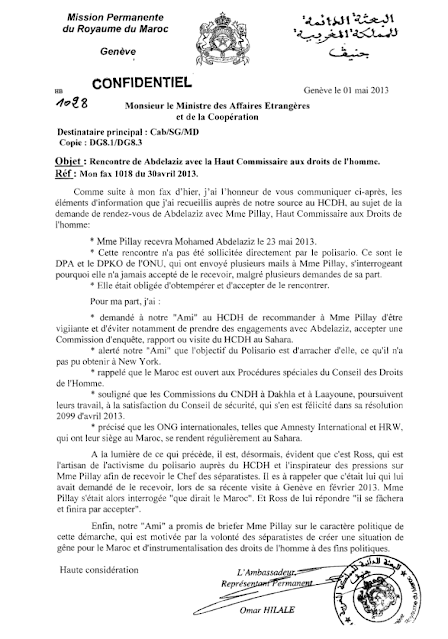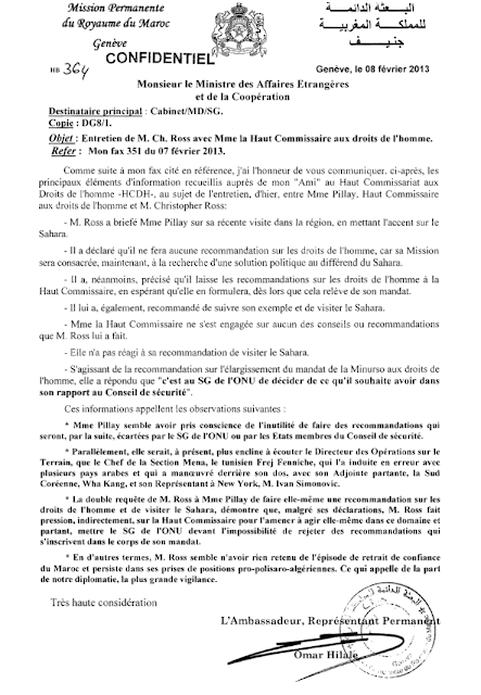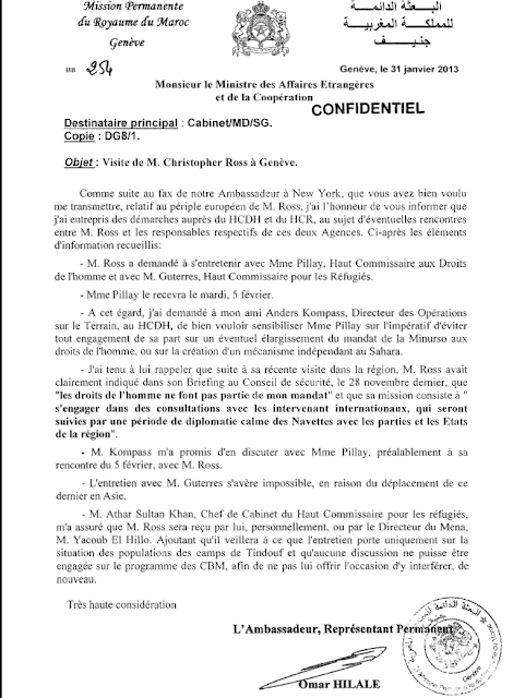 The confidential diplomatic note dated January 31, 2013, sent by Omar Hilale to Morocco’s Foreign Minister, detailed Moroccan efforts to limit Christopher Ross’s contacts with UN agencies and prevent human rights issues from being integrated into his mandate.