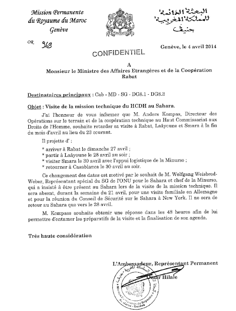 In this document dated April 4, 2014, Omar Hilale informed his minister of the planned visit of a technical mission from the Office of the High Commissioner for Human Rights (OHCHR) to Western Sahara. Anders Kompass, then Director of Field Operations at OHCHR, requested that his visit (initially scheduled for April 23) be postponed until the end of April 2014.