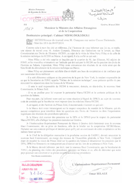 In this document dated August 6, 2014, Anders Kompass informed Omar Hilale that Navi Pillay, the outgoing High Commissioner, had expressed concern about the UN’s new directions regarding human rights in the Sahara, while remaining satisfied with the existing cooperation framework with Morocco.