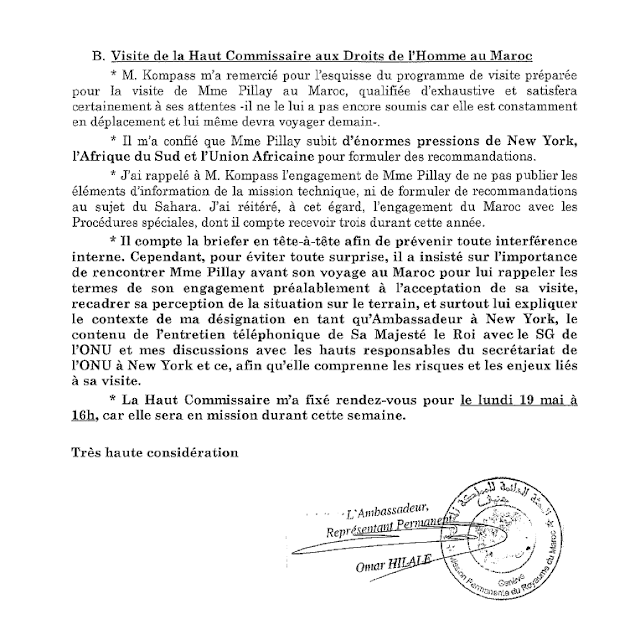 - Ambassador Hilale concluded that Ross was using UN agencies (OHCHR, UNHCR) to increase pressure on Morocco and serve his own agenda.