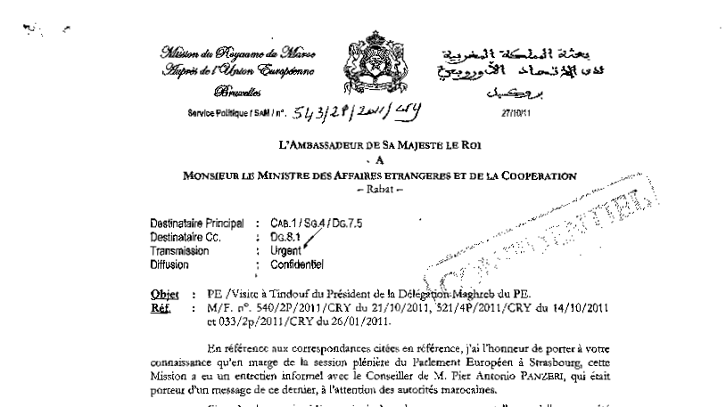 في مذكرة « عاجلة » مؤرخة في أكتوبر 2011 أرسلتها البعثة المغربية لدى الاتحاد الأوروبي إلى الرباط، أشير إلى أنه « على هامش الجلسة العامة للبرلمان في ستراسبورغ »، أجرى ممثل واحد على الأقل للبعثة « مقابلة غير رسمية » مع مستشار السيد بانزيري، الذي كان يحمل رسالة « موجهة إلى السلطات المغربية ».