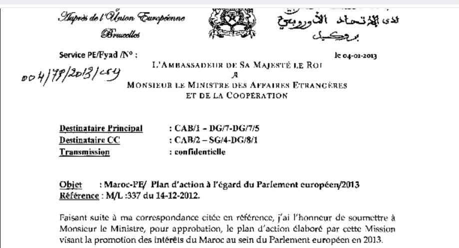 يشرفني أن أعرض على السيد الوزير، قصد الموافقة، خطة العمل التي أعدتها هذه البعثة بهدف تعزيز مصالح المغرب داخل البرلمان الأوروبي لعام 2013، بهدف التصدي للنشاط المتزايد لخصومنا.