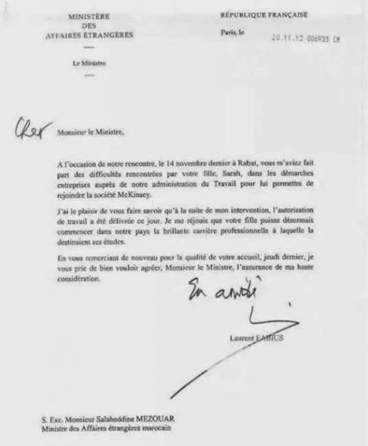 رسالة من الوزير صلاح الدين مزوار إلى وزير الخارجية الفرنسي يطل فيها تسهيل شهادة الإقامة لإبنته ليتسنى لها العمل في شركة مكنسي