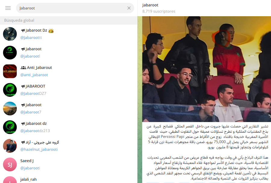 Selon des rapports que Jabaroot affirme avoir obtenus de l’intérieur du palais royal, l’opulence des acquisitions royales a été révélée, soulevant de profondes questions sur les disparités de classes. La princesse marocaine Lalla Khadija aurait ainsi acquis une paire de boucles d’oreilles chez le célèbre joaillier italien Percossi Papi pour un prix exorbitant de 75 000 euros, au sein d’une collection de bijoux précieux pesant près de 5 kilogrammes et dont la valeur dépasse les 8 millions d’euros.