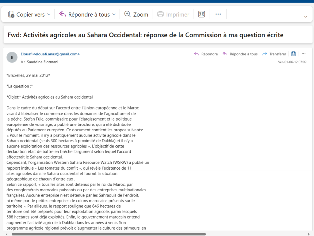 « Pour le moment, il n’y a pratiquement aucune activité agricole dans le Sahara occidental (seuls 300 hectares à proximité de Dakhla) et il n’y a aucune exploitation des ressources agricoles ». L’objectif de cette déclaration était de battre en brèche l’argument selon lequel l’accord affecterait le Sahara occidental.