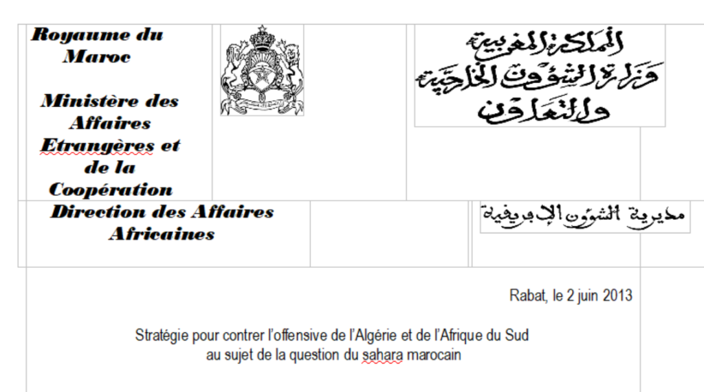 La note propose une stratégie visant à « contrer l’offensive diplomatique de l’Algérie et de l’Afrique du Sud sur la question du Sahara marocain ». Il préconise de dénoncer, auprès des partenaires africains, internationaux et des médias, « l’attitude hostile de l’Algérie envers l’intégrité territoriale du Maroc, ainsi que ce qu’il considère comme « la duplicité de son discours qui dissocie faussement le différend du Sahara des relations de voisinage ».