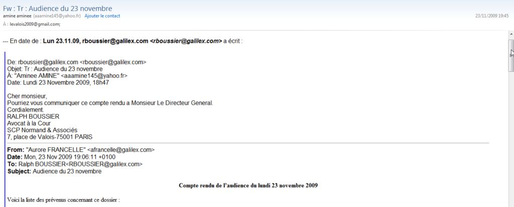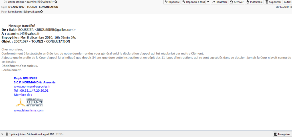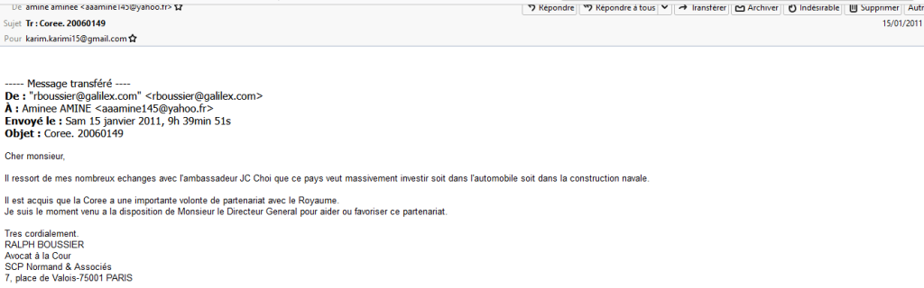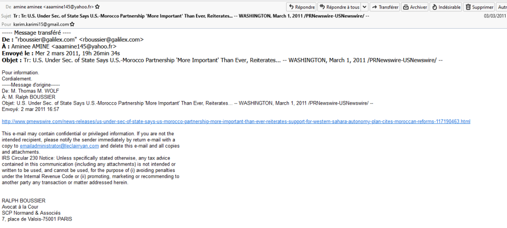 Dans un mail datant du 23 novembre 2009, Chris_Coleman24 révèle que l’avocat français Ralph Boussier du Cabinet Normand et Associés demande à son officier traitant marocain de transférer « un compte rendu d’audience » à « Monsieur Le directeur Général », qui n’est autre que le patron de la DGED, Yassine Mansouri.