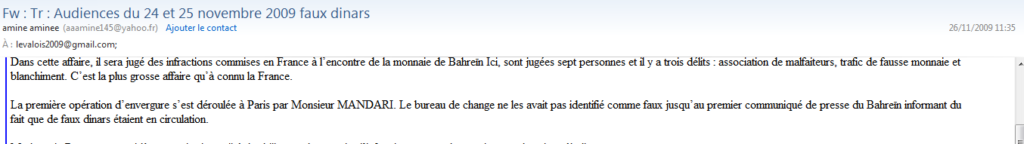Le compte rendu concerne une affaire de faux billets bahreinis imprimés en Argentine et échangés en France pour une valeur de 300 millions d’euros disséminés au Niger, au Tchad, au Liban, en Belgique, en Suisse et en France ! Le mail fait référence à Hicham Mandari, un marocain abattu par balles au sud de l’Espagne en aout 2004 . Selon le mail signé par Aurore Francelle, avocate associée de Ralph Boussier, Mandari aurait effectué la première opération de change d’envergure de ces faux billets à Paris. La présence du nom d’un marocain dans cette affaire aurait-elle à elle seule justifié que la DGED soit mise au parfum?