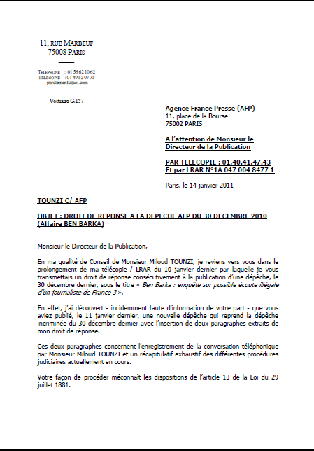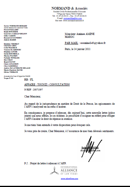 Contacté par @si pour savoir si ce document était authentique, le cabinet Normand & Associés a vérifié le numéro de dossier (20071097) figurant sur la note d’honoraires. « A priori, ça ne vient pas de chez nous », nous a-t-on dit au bout de quelques minutes. L’avocat Ralph Boussier, dont la signature figure au bas de cette note d’honoraires, n’était pas disponible à l’heure où nous publions cet article. Tout comme Me Rodolphe Bosselut, l’avocat de Maroc Hebdo.