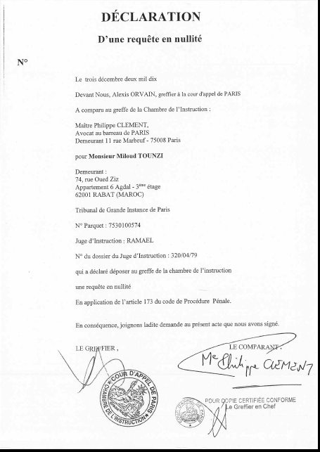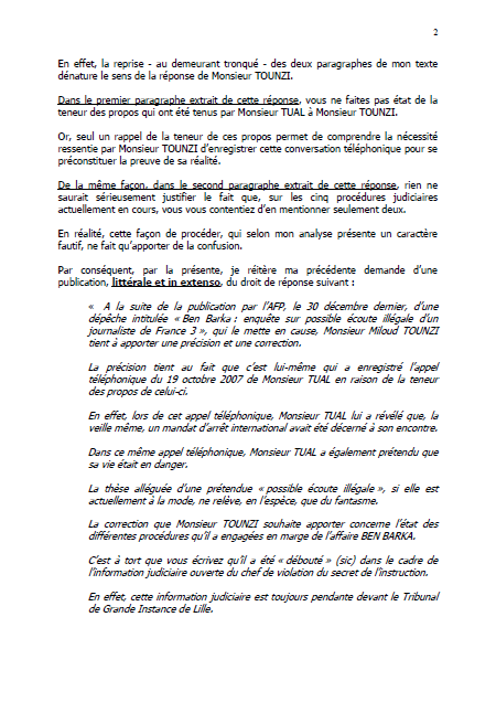 D’après les retranscriptions de cette conversation téléphonique qui s’est tenue le 19 octobre 2007, Tual prévient Tounzi qu’il va faire l’objet d’un mandat d’arrêt dans quelques jours et il lui suggère de quitter le territoire marocain car sa vie serait en danger. Un extrait de la conversation pour le moins gênant pour le journaliste de France 3 : cela sous-entend qu’il est de mèche avec le juge d’instruction.