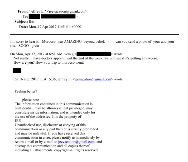 EPSTEIN : I’m sorry to hear it. Morocco was AMAZING beyond belief. Can you send a photo of you and your tits. SOOO great.