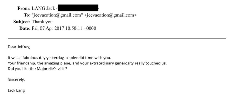 Le 17 avril 2017, il écrit ici à Jeffrey Epstein : « Cher Jeffrey, Hier, nous avons passé une journée fabuleuse, un moment merveilleux en ta compagnie. Ton amitié, le magnifique avion et ton extraordinaire générosité nous ont profondément touchés. As-tu apprécié la visite chez Majorelle ? Sincèrement, Jack Lang. »