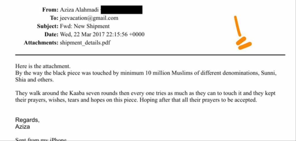 تظهر رسائل البريد الإلكتروني أن رائدة الأعمال مقيمة الإمارات عزيزة الأحمدي، التي يُقال إنها سعودية الجنسية، تعمل مع شريك اسمه عبد الله المعري لتنظيم العملية اللوجستية. تم شحن القطع من السعودية إلى فلوريدا عبر الخطوط الجوية البريطانية، مع اهتمام دقيق بالفواتير والجمارك والتوصيل داخل الولايات المتحدة.