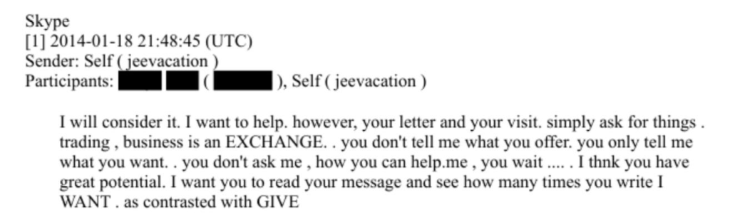 I will consider it. I want to help. however, your letter and your visit. simply ask for things. trading, business is an EXCHANGE. . you don’t tell me what you offer. you only tell me what you want. . you don’t ask me, how you can help.me, you wait …. . I thnk you have great potential. I want you to read your message and see how many times you write I WANT. as contrasted with GIVE