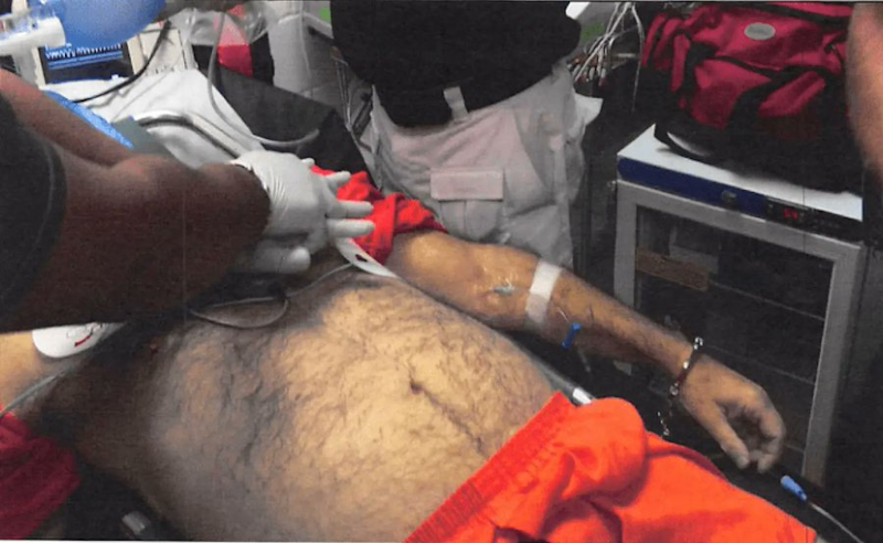 Les documents incluent un rapport d’enquête sur le décès du FBI du bureau de New York et un rapport du bureau du lieutenant du Centre correctionnel métropolitain (MCC). Parmi les images, on voit Epstein avec son uniforme orange de prison déchiré, des électrodes TENS fixées sur sa poitrine nue, une minerve cervicale, et relié à une bouteille d’oxygène avec un tube dans la bouche. Il est également branché à une perfusion intraveineuse.