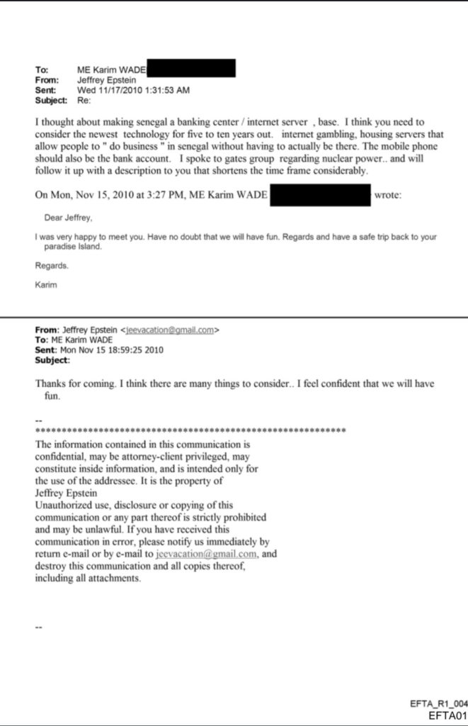 En 2010, Jeffrey Epstein proposait à Karim Wade la création d’un hub bancaire, des infrastructures pour serveurs internet, des jeux d’argent en ligne, mobile money et énergie nucléaire avec le Gates Group. A l’époque, Karim Wade, fils du président Abdoulaye Wade, était Ministre de la Coopération internationale, Ministre des Transports terrestres et aériens, Ministre des Infrastructures.